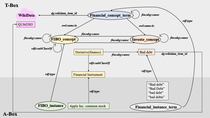 Also, we give an example showing how to associate the nodes "Bad debt" with 'fincakg:cause' relations in RDF/Turtle format: