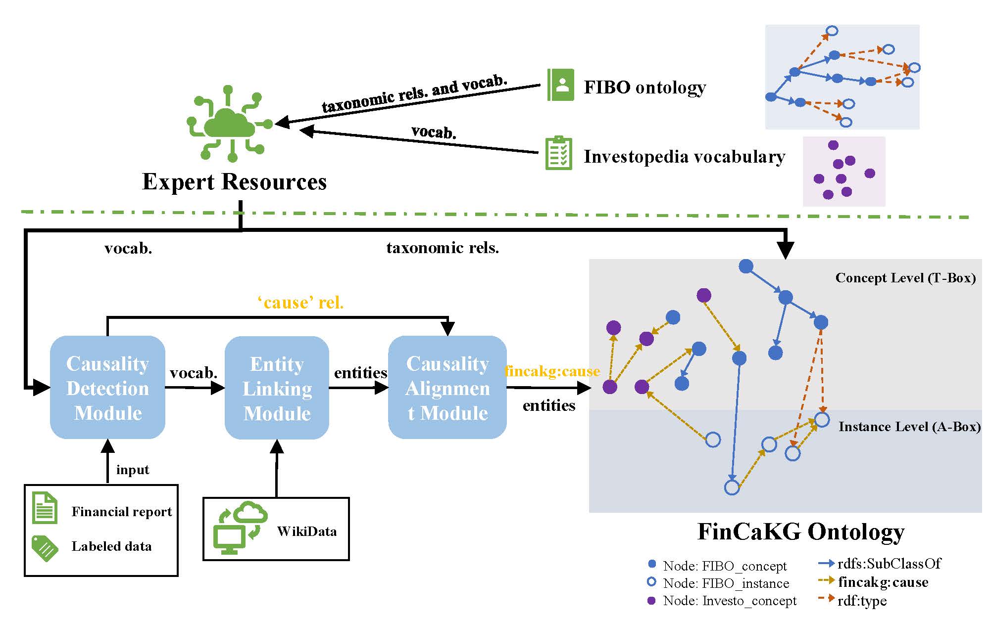 To generate such a functional knowledge graph, we propose the methodology of causality detection module, entity linking module, and causality alignment module to automatically construct FinCaKG with the guidance of expert financial ontology - FIBO. Correspondingly, we draw the entire framework of constructing FinCaKG step by step: