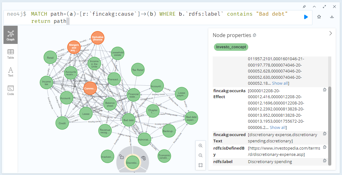 Knowledge graph visualization. In the following demo, we demonstrate a case study of seeking for causes of a given keyword, i.e. "bad debt", using the visualization tool - Graphlytic. If the video is too small in your broswer, please click the upper-right button to pop out in a new tab.